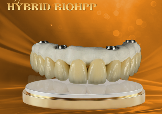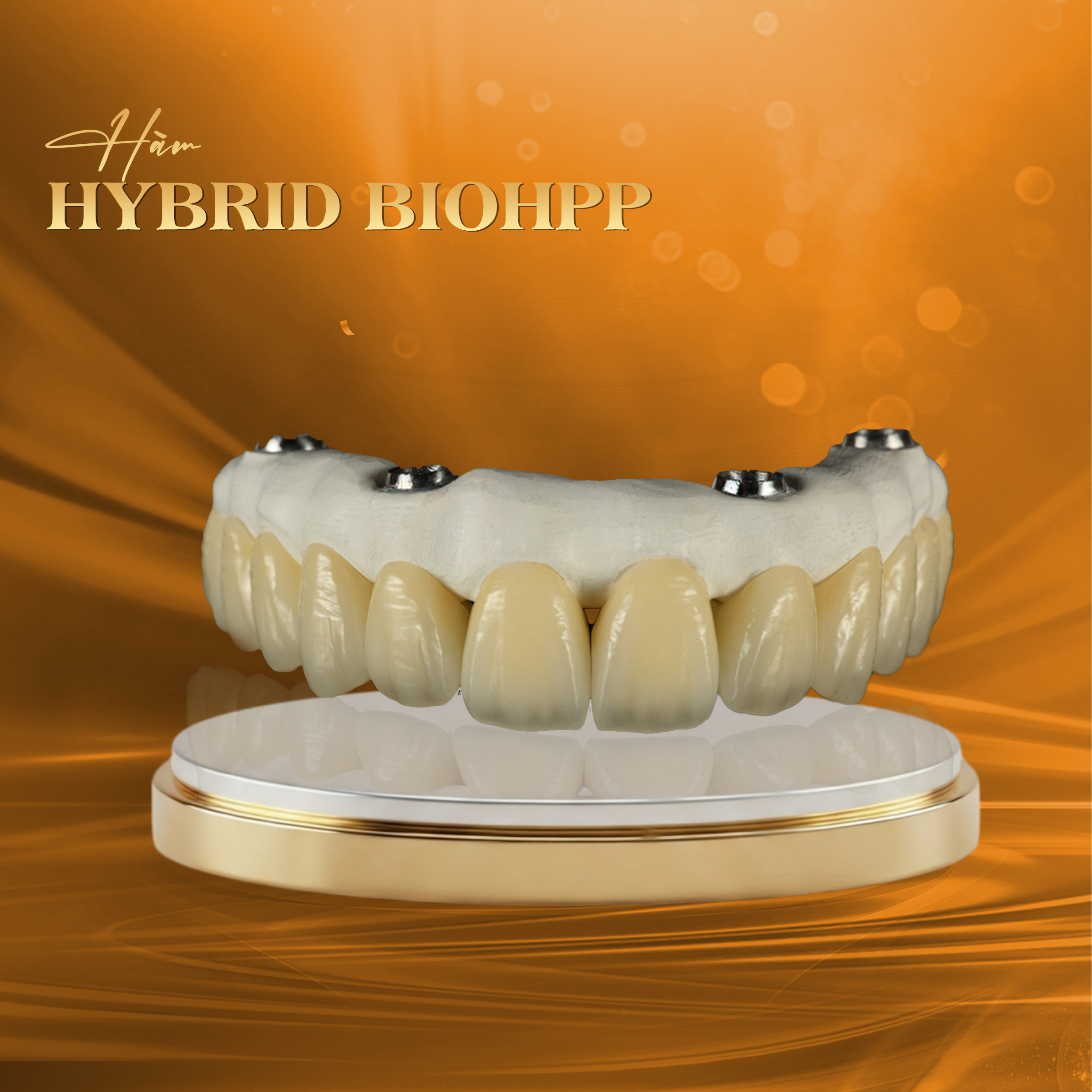 Hàm Hybrid BioHPP là loại phục hình toàn hàm cố định trên Implant, sử dụng khung sườn bằng vật liệu BioHPP – một loại polymer công nghệ cao (PEEK cải tiến) có tính đàn hồi gần giống xương người.