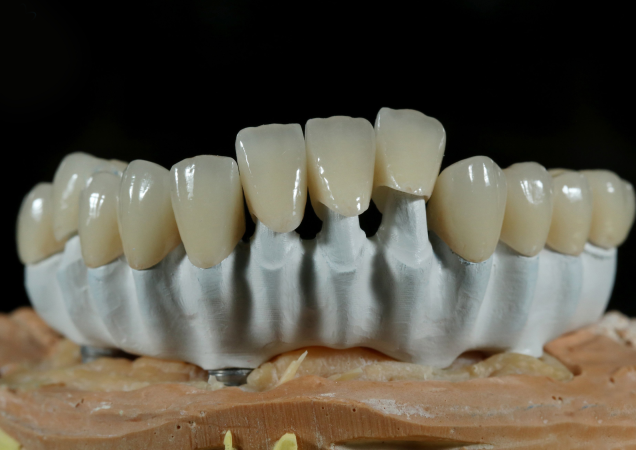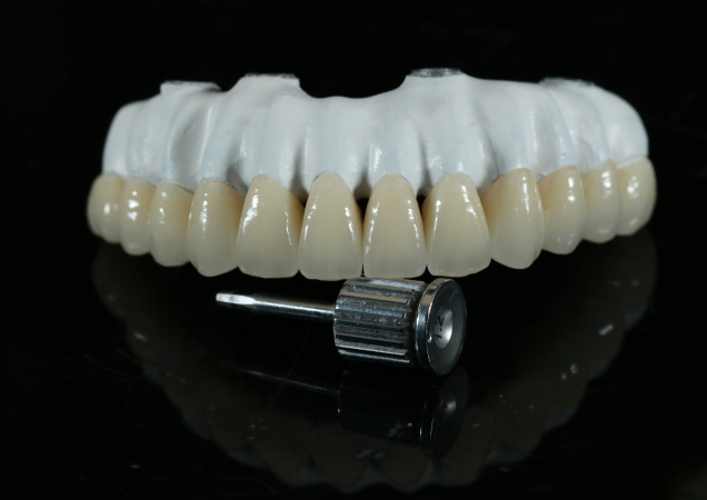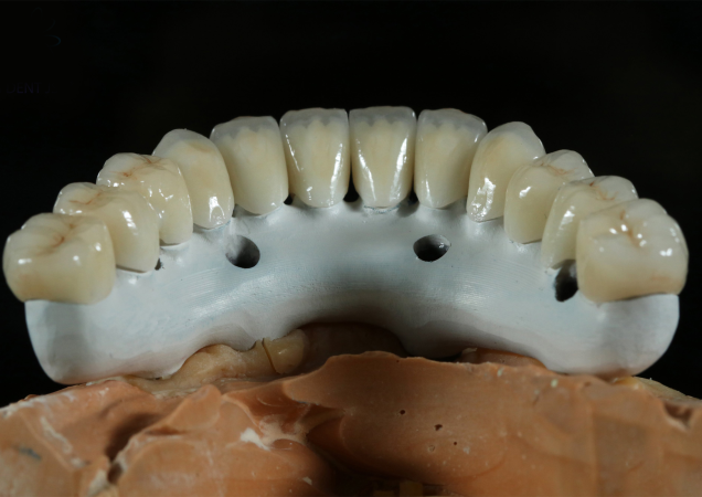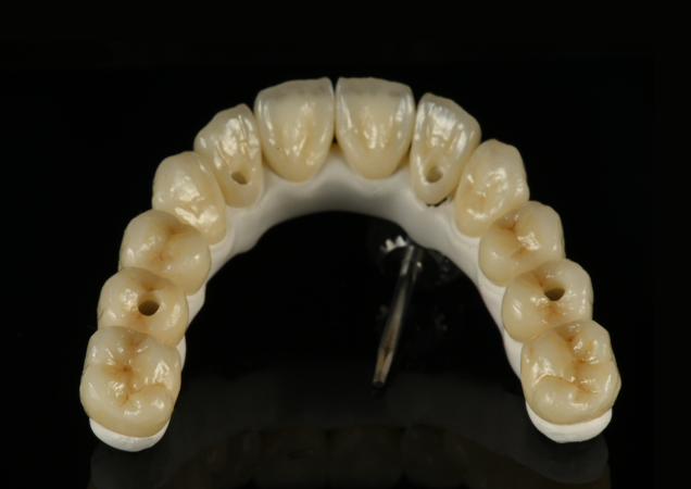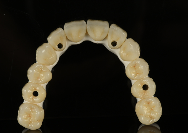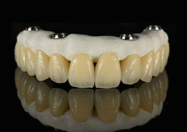 – Răng giả phục hình (sứ hoặc composite) được gắn lên khung, tái tạo toàn bộ cấu trúc hàm răng.