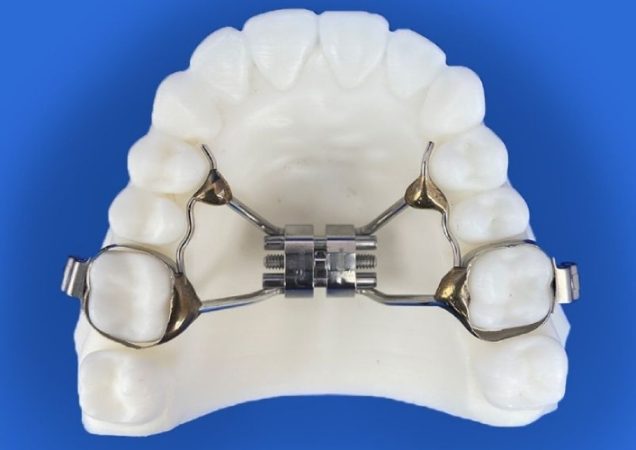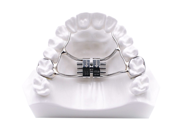Hàm nong nhanh có ốc nong ở giữa vòm miệng, khi vặn ốc theo hướng dẫn của bác sĩ, lực sẽ tác động đồng đều lên hai nửa xương hàm trên, tách nhẹ đường khớp giữa, giúp hàm nới rộng nhanh chóng.